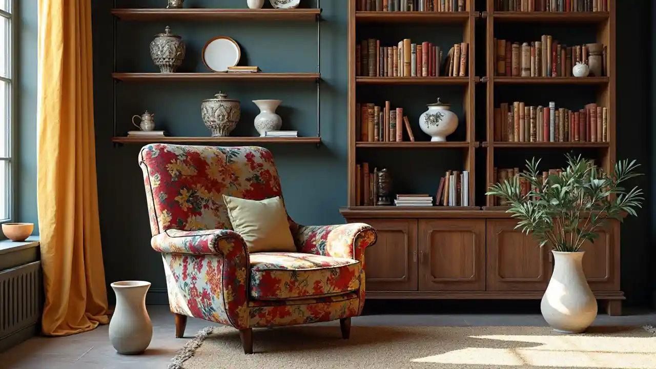 Picha halisi ya kiti cha mizigo kilicho karibu na rafu ya vitabu yenye urefu wa meta nyingi, na rangi tatu zenye upatano na michoro yenye nguvu, na alama za vitu vya kikaboni vilivyowekwa kwa njia ya kimkakati ili kuongeza muundo, na kuamsha hisia za uzuri na faraja.