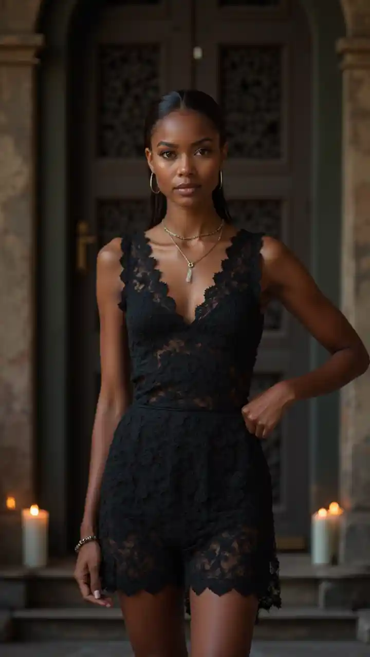 Wazia mwanamke mwenye ngozi laini ya karamu, aliyevaa mavazi meusi ya laini, akiwa amesimama kwa uhakika mbele ya mlango wa ulimwengu wa kale. Msimamo wake mzuri na usemi wake wenye kujiamini huvutia, na nuru ya mishumaa inayozunguka huongeza uzuri wake.