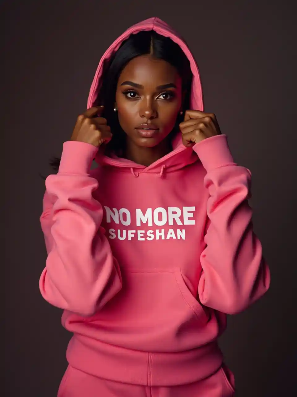 Scene Start: A brown-skinned woman in a bright pink hoodie and jogger set stands front and center. Her hoodie reads “NO MORE Suffering.” The vibe is bold, elegant, and unshaken. Camera Movement: Start with a slow zoom-in on her face. She adjusts her hood with both hands, locking eyes with the camera. A subtle breeze lifts a strand of hair. Lighting Direction: Use soft glam lighting that gently highlights her cheekbones, the pink tones of her outfit, and the empowering message on the clothing. Add a very soft studio light glow on the edges for a luxe finish. Mid-Scene Motion: She shifts her weight slightly and turns to the side. The camera follows the motion — smooth and graceful. Music Cue: Use a cinematic, female empowerment instrumental — think a slowed-down violin with trap-style drums building softly in the background. (Similar to the "Be Alive" by Beyoncé intro.) Final Scene: She faces front again, crosses her arms, and stares into the lens. The background subtly darkens behind her,