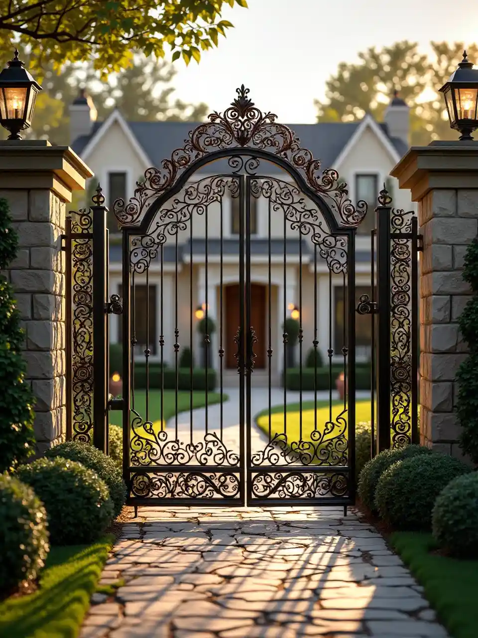 Lango la chuma la nyumba ya kifahari, iliyobuniwa kwa njia ya pekee na yenye mapambo mengi, yenye mwangaza wa dhahabu, yenye mazingira mazuri, yenye mimea inayostawi WARECOLOR STYLE na njia za kifahari, yenye mazingira mazuri, yenye nyasi zenye kupendeza, na mandhari ya nyumba kubwa ya usanifu, yenye ubora wa juu na yenye mambo mengi, inayoonyesha ubora wa kifahari.