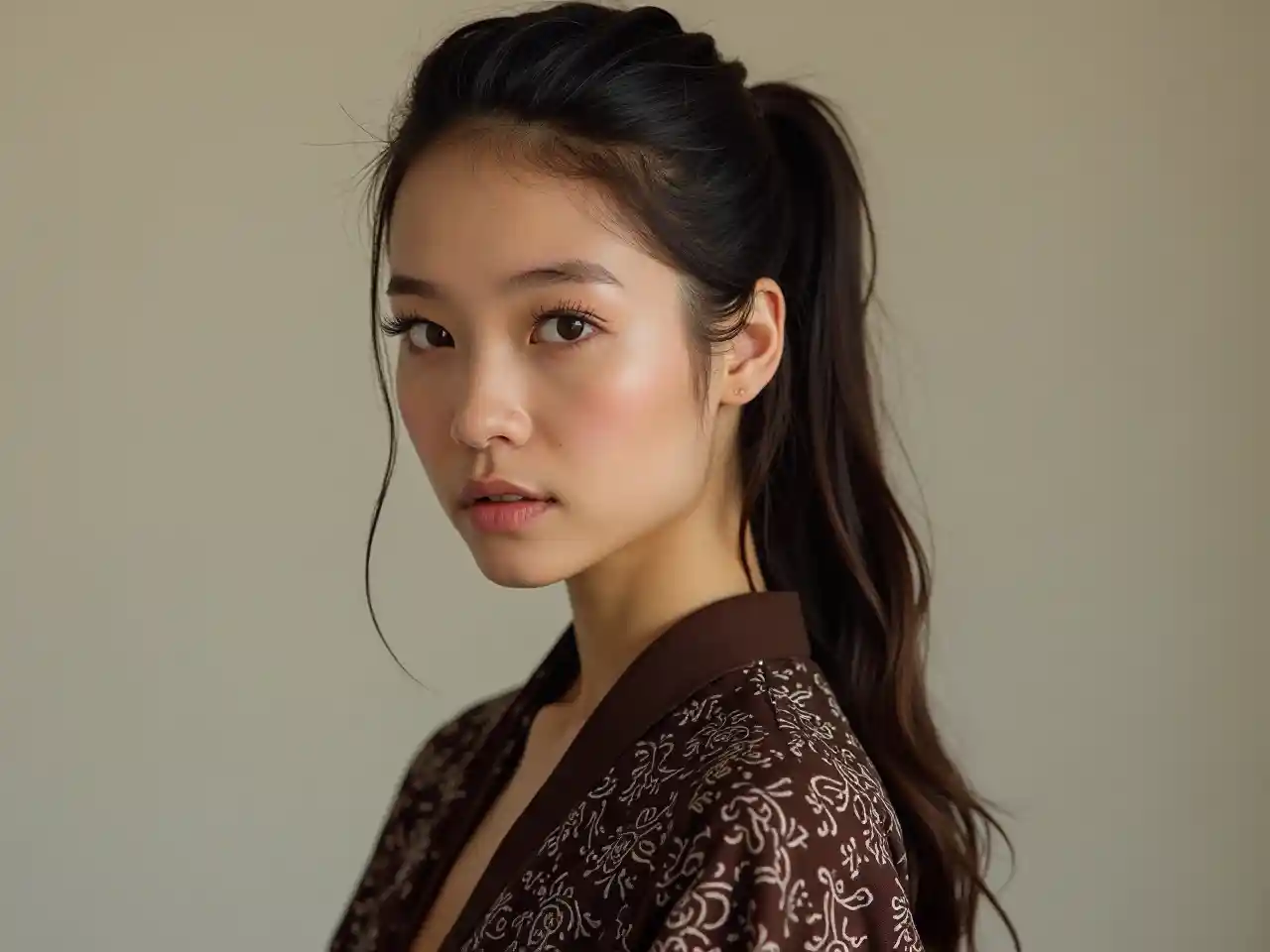 Picha ya mwanamke mchanga mwenye fahari na ubunifu, na nywele zake zimepambwa kwa mkia wa farasi, zikiwa zimepambwa kwa upole na nywele. Anavaa vazi la juu lenye rangi ya sokoni nyeusi lenye mitindo yenye kuvutia, na hivyo kuonyesha kwamba anafuata mitindo ya kisasa. Mtazamo wake wenye usawaziko na mchanganyiko wa mambo ya kitamaduni na ya kisasa huleta hisia za kupendeza.