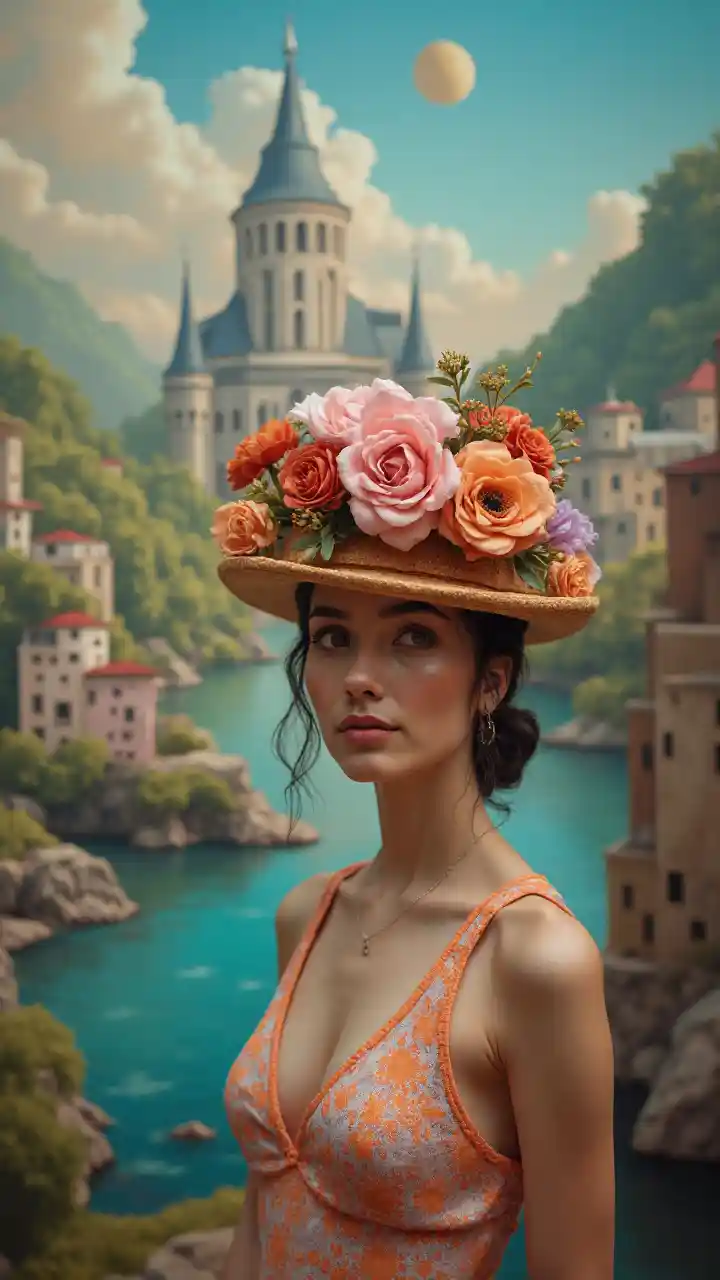 (mwanamke na kofia na maua juu ya kichwa chake), amesimama mbele ya (surrealist uchoraji wa mji), hawakupata katika (sanaa picha) na (mtindo picha), incarnation ya uzuri na ubunifu, rangi hai, focus laini, high mitindo maelezo, mchanganyiko wa kweli na surreal, background eclectic na artistic flair, anga ya ndoto, (4K), (ultra-detailed).