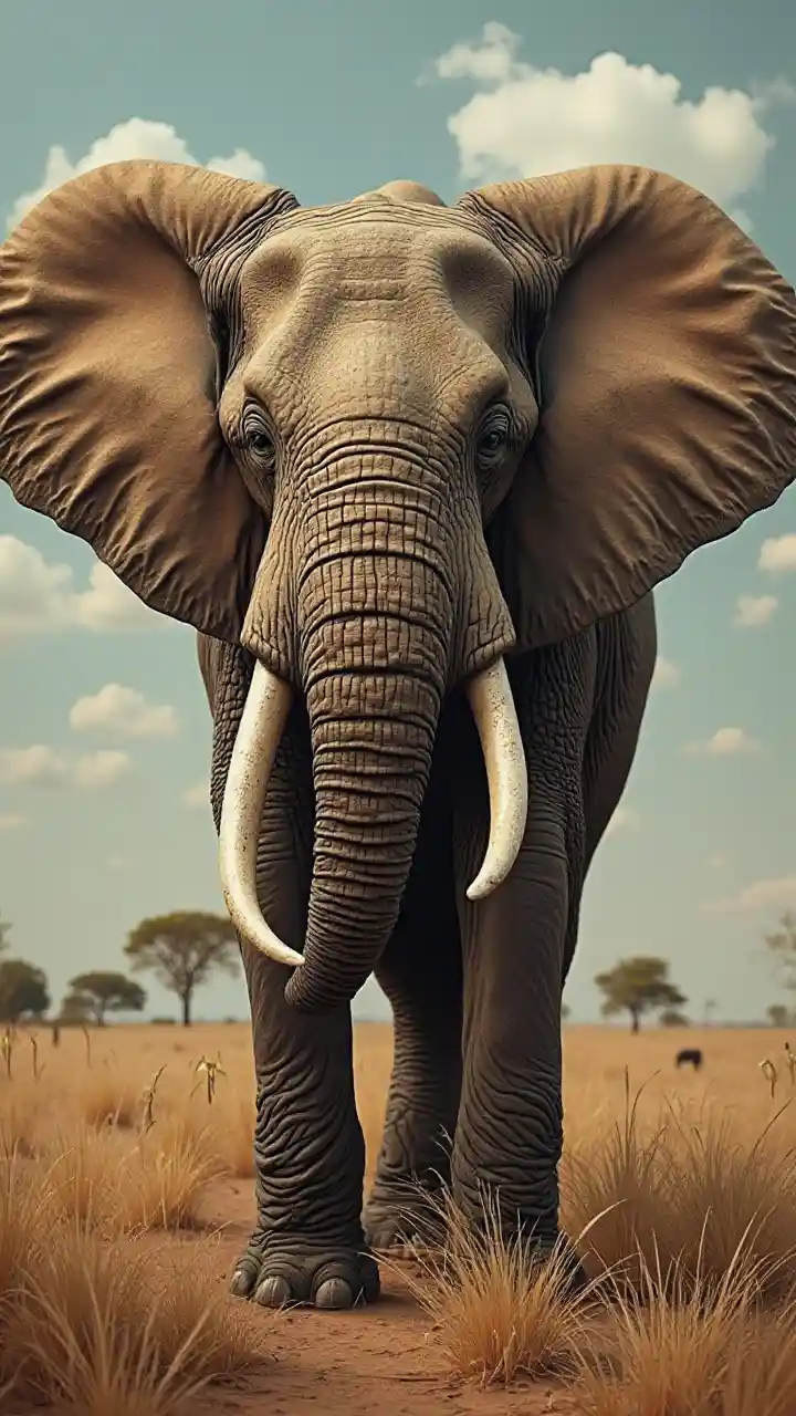 Aina ya Picha: Picha (((Maelezo ya Mada: kichwa cha ukuta halisi)) Picha halisi ya picha ya tembo iliyochanganywa na uso wa binadamu barani Afrika iliyoonyeshwa kwa njia ya kikabila na kuelezea umuhimu wa tembo barani Afrika.
