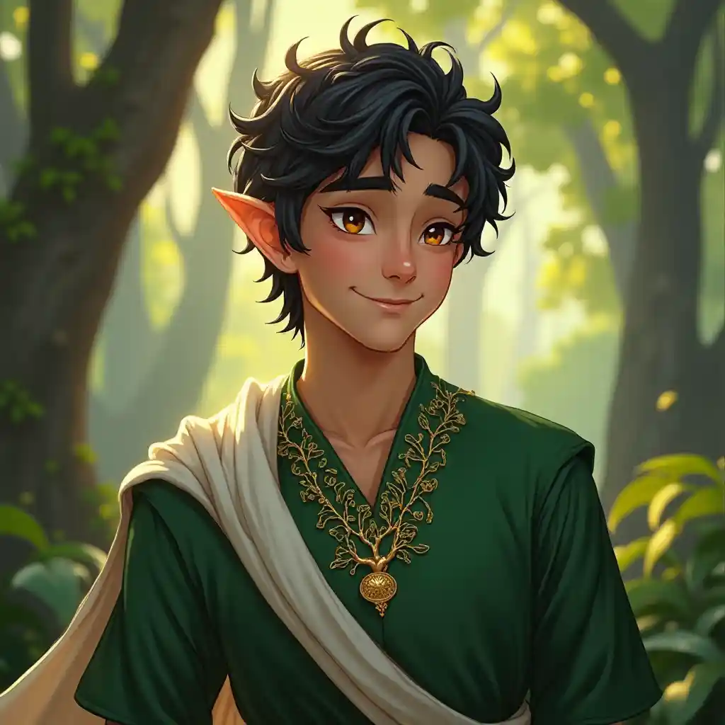 (kijana kiume elf kiongozi), tabasamu laini,nywele fupi curly nyeusi,kuvutia macho ya dhahabu,safi kunyolewa,kuvaa tunic ya kijani kupamba na siver tata na dhahabu,na parament nyeupe,na pendant mti wa maisha,rangi hai, mazingira ya joto,mchakato wa msitu,mwanga, kuonyesha kina na kina, 4K azimio,mandhari ya fantasy, anga ya kicha.