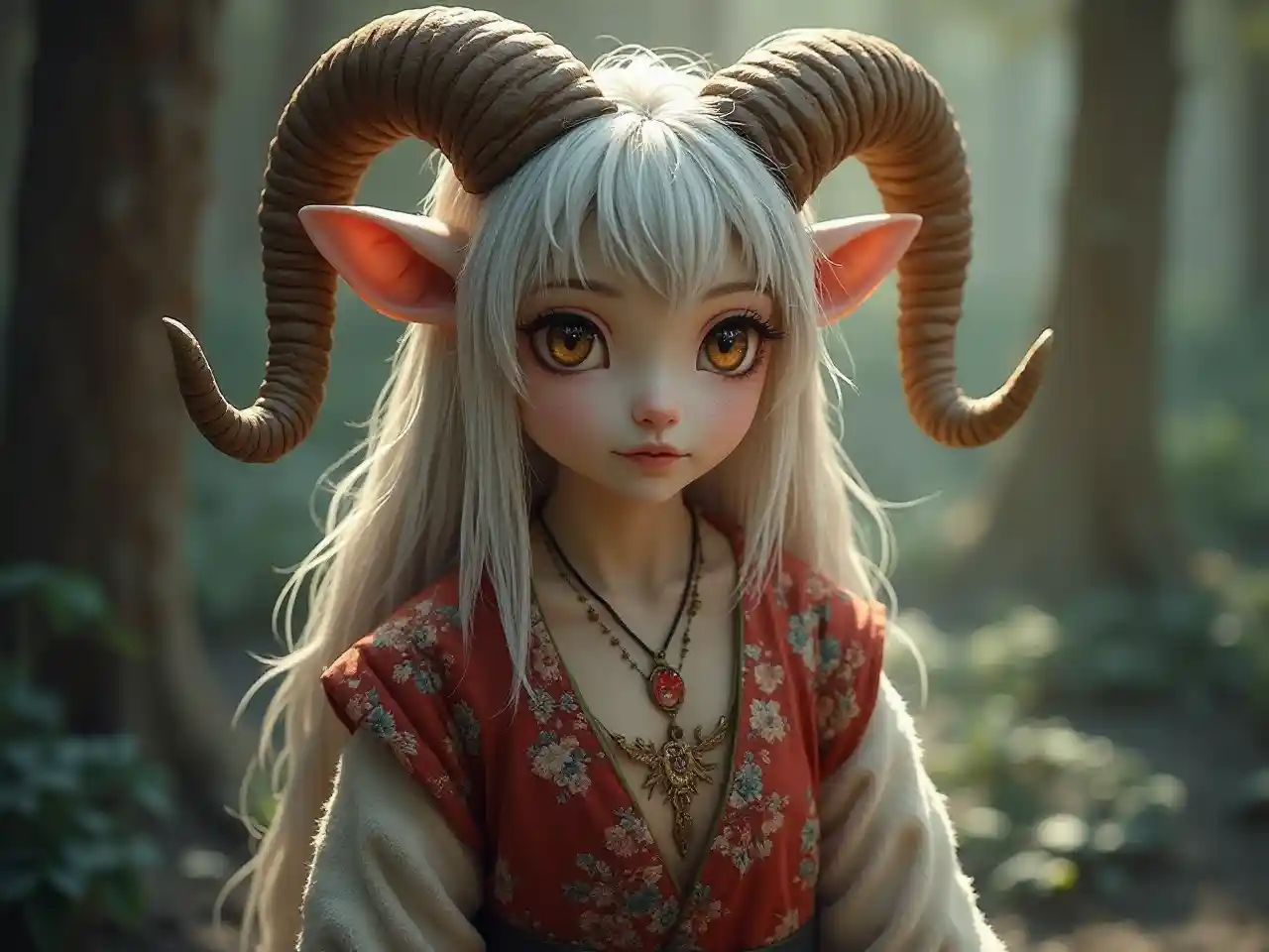 masikio ya Elf, faun, taa, furry, ngozi, macho ya mbuzi, midomo ya kondoo, amevaa nguo za Asia, na masikio moja tu.