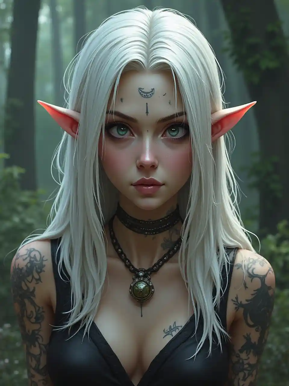 Benjaminmwanamke, nywele nyeupe, macho nyeusi, elf, tattoo