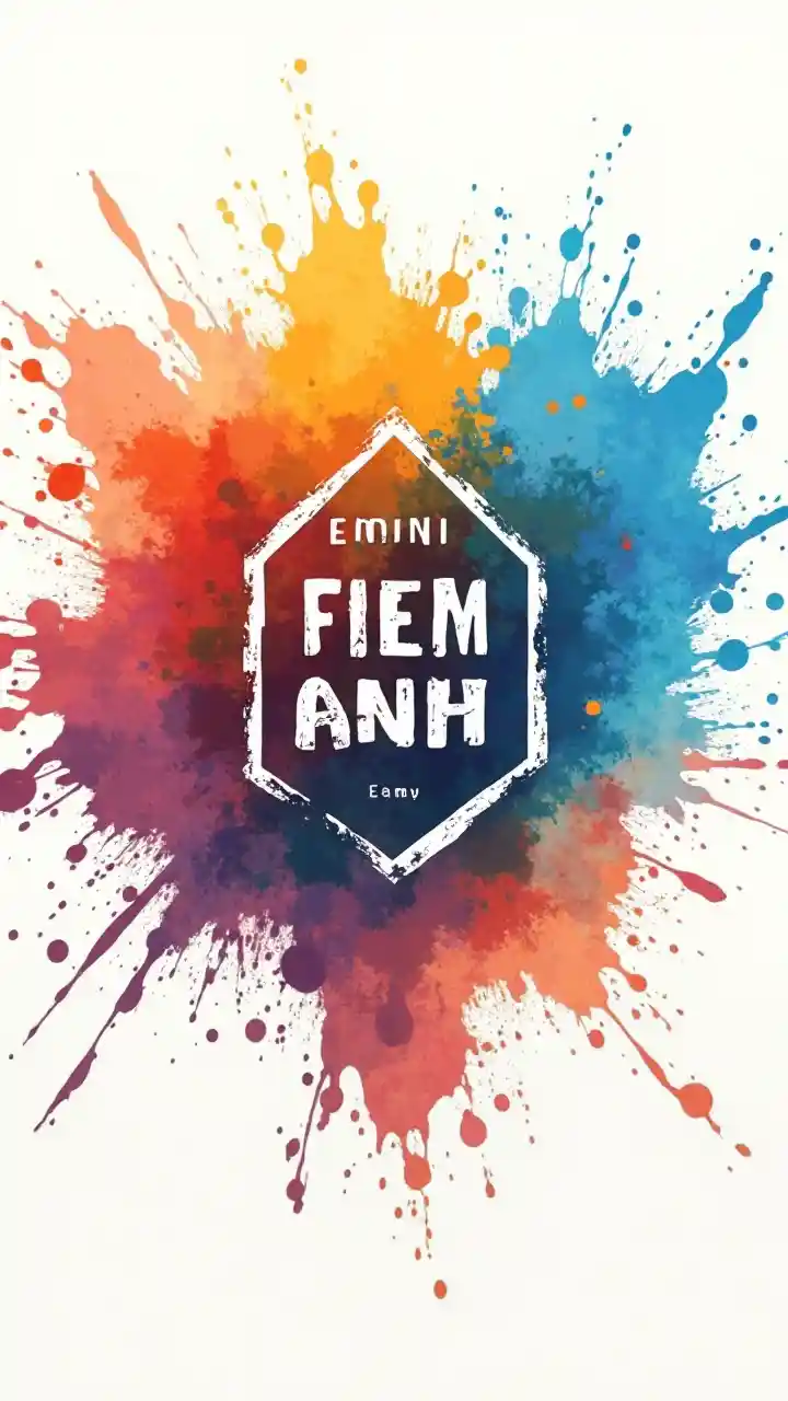 Erstelle mir ein Firmen Logo für eine Handwerkliche Firma genannt Emini Raumgestalter im Hintergrund soll es wie eine Farbe Explosion sein und im Vordergrund eine Weiße Blase mit dem Namen der Firma und auch Pinsel Hammer und Leiter sollen zusehen kuwa