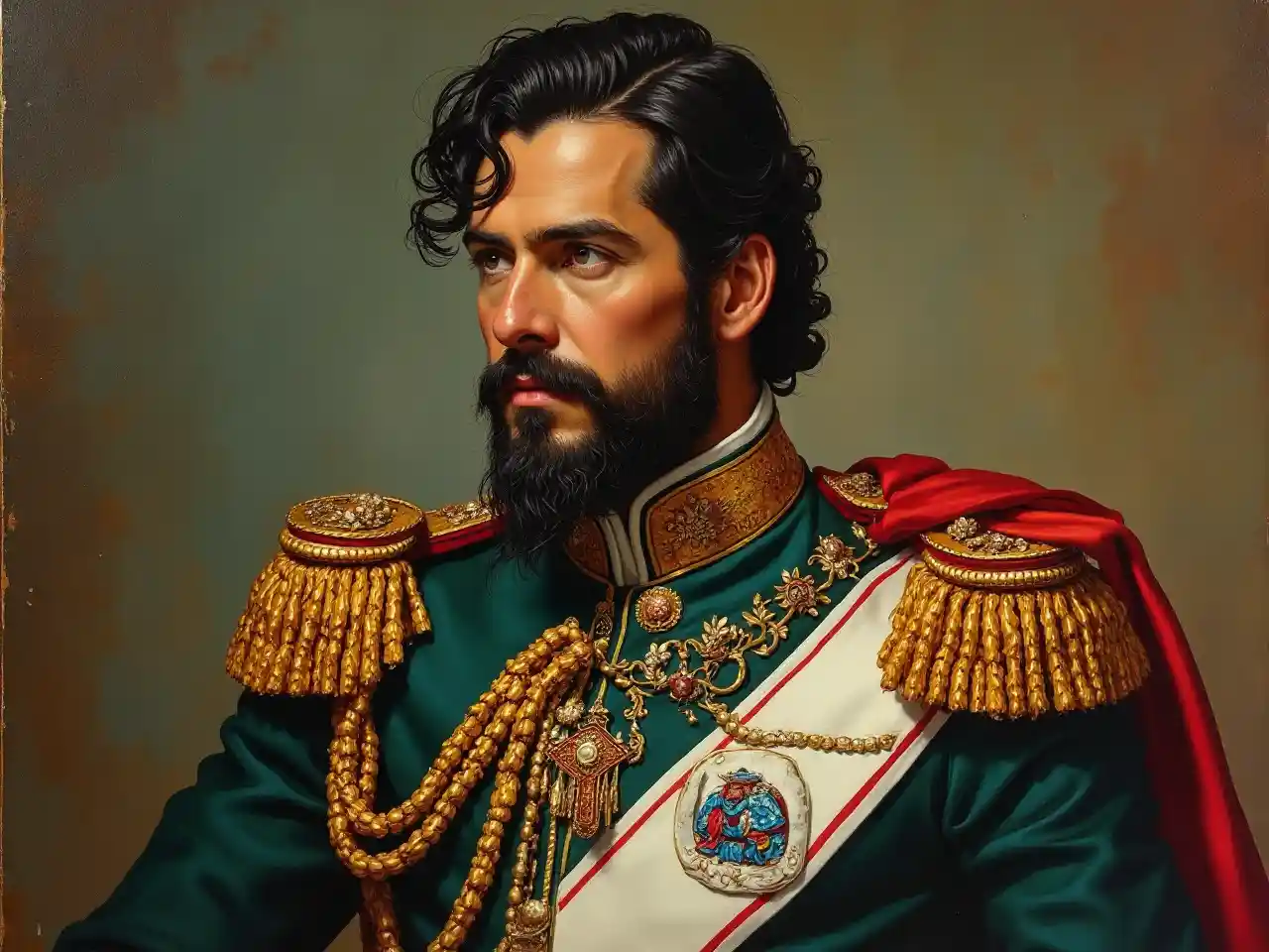 Uchoraji wa mafuta wa mtu mwenye umri wa miaka 34 aliyevaa kama Mfalme wa Mexico ana bendera ya Imperial na alama za Imperial ana rangi ya bluu na kidogo ya kijivu Macho yake ni ya bluu ndefu na nzito Yeye ni mzuri picha ni ya mwili wa ukanda kwa juu picha ya juu ya ubora