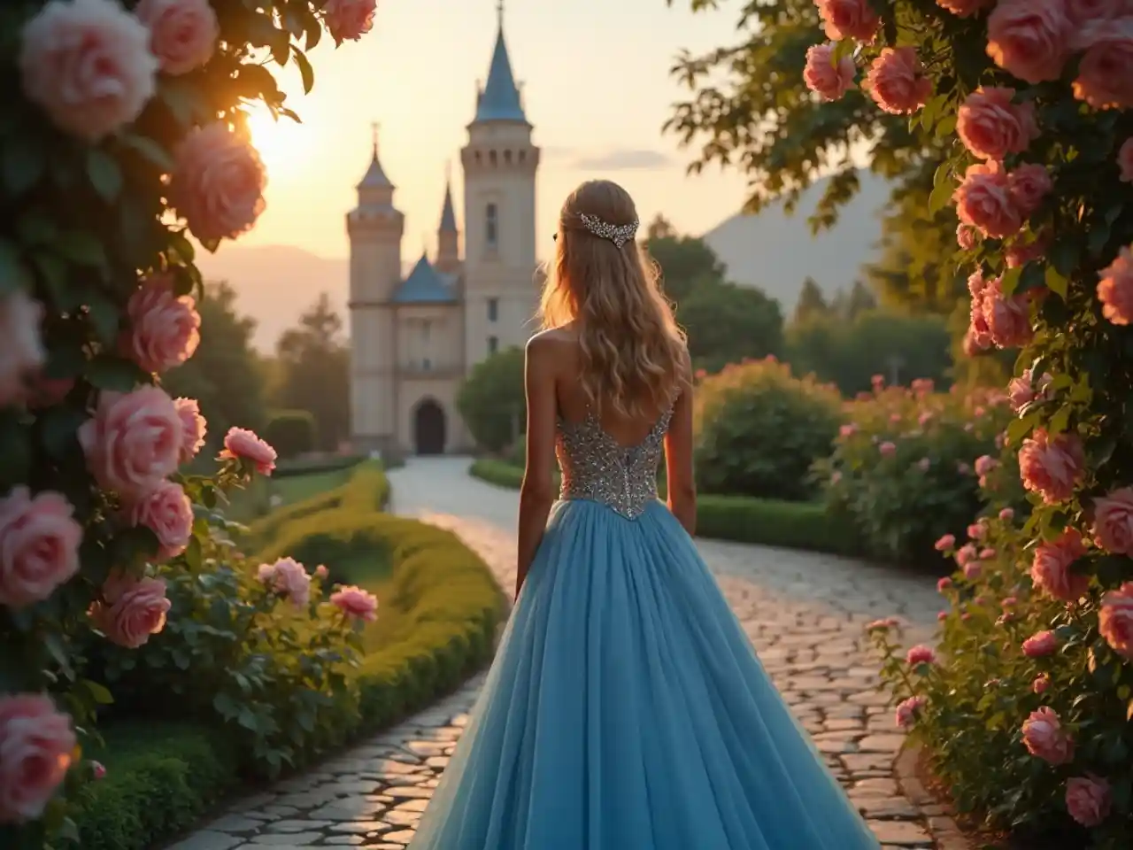 Akiwa amefunikwa na mwangaza wa saa ya dhahabu, mwanamke kijana anasimama kwa fahari akiwa amevaa vazi la bluu lenye kuvutia na mapambo ya maua, akidokeza mandhari ya hadithi. Nywele zake ndefu zenye mawimbi huteleza kwa uzuri kwenye mgongo wake, na juu ya kichwa chake kuna taji lenye kung'aa, na hivyo kumfanya awe na kipaji cha kifalme. Akiwa amezungukwa na waridi wanaopanda kwenye mlango wake, anatazama ngome kubwa yenye minara ya bluu iliyo katikati ya mimea mingi. Njia ya mawe ya kupigia mawe humwongoza mtazamaji kwenye nyumba hiyo, na hivyo kumfanya mtu ashangae na kupendezwa na mandhari hiyo yenye kupendeza. Muundo huo wa jumla unachanganya hali ya utulivu na hadithi ya kichawi, na kuamsha wakati mzuri wa kutarajia na uzuri.