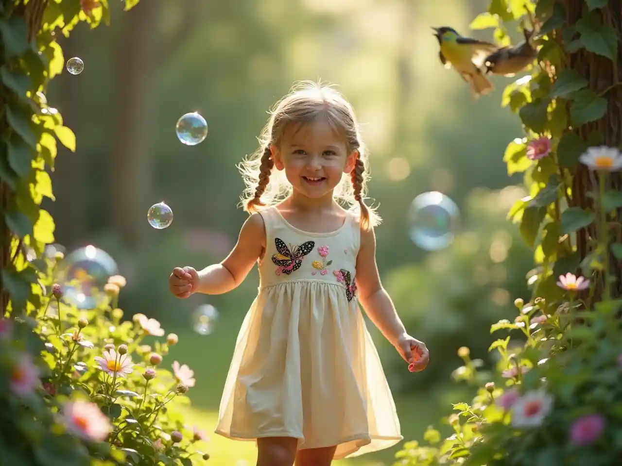Msichana mmoja Mzungu mwenye umri wa miaka 5 mwenye mikia ya nguruwe, akiwafuatia vipepeo katika bustani ya hadithi za uwongo. Mzabibu wenye kung'aa na ndege-mwitu wanaopaaza sauti humweka katika mazingira yenye kuvutia.