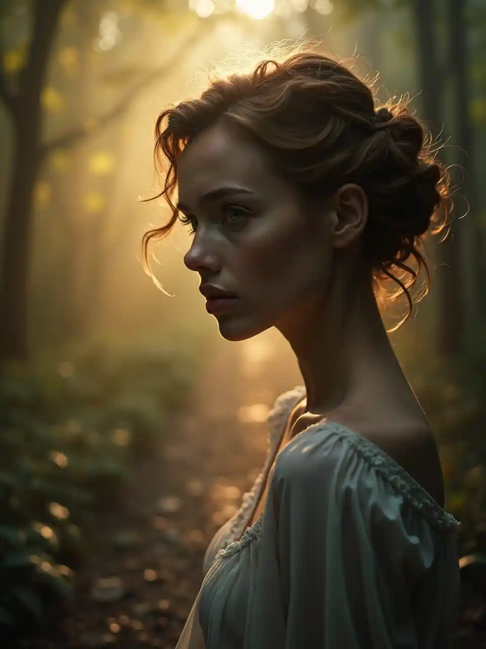 (((upinde wa polepole, njia ya ethereal))), iliyofunikwa na (nuru laini, ya asili)), ambayo huangaza kwa upole (mchoro wa siri)) nyuma, ikififia katika (ngurumo ya ndoto) ambayo inaongeza (nuru ya dhahabu) kwenye eneo. Ngozi ya mtu huyo ni nyeupe (isiyokuwa na kasoro), na (macho yanayong'aa) na (midomo yenye nguvu, yenye rangi) ambayo huongeza hisia za wakati huo. Vivuli vya giza na (mazingira ya wazi) huongeza hali ya ndoto kwa kuunda hisia za (mambo) na (uzuri wa fantasy).