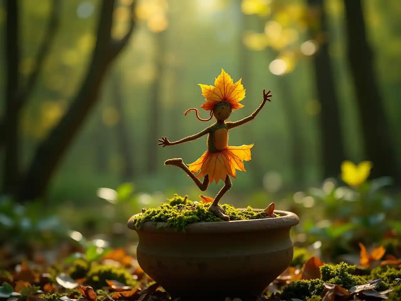 Mchoro mdogo wa ajabu uliofanyizwa na majani ya vuli yaliyowekwa vizuri, ukicheza dansi isiyo na wasiwasi kwenye ukingo wa sufuria ya udongo iliyofunikwa na moshi, ikiwekwa juu ya mandhari ya msitu wenye rutu, ambapo nuru ya jua hupenya kupitia kivuli cha juu, ikitoa vivuli vyenye kutatanisha. Mazingira ya kilimwengu ni ya hali ya juu, na rangi ya siena, umber, na kijani-mzeituni, na rangi ya zambarau na ya dhahabu, na kuamsha hisia za kushangaa na kufurahia, kana kwamba umeponyoka kutoka ulimwengu wa ajabu.