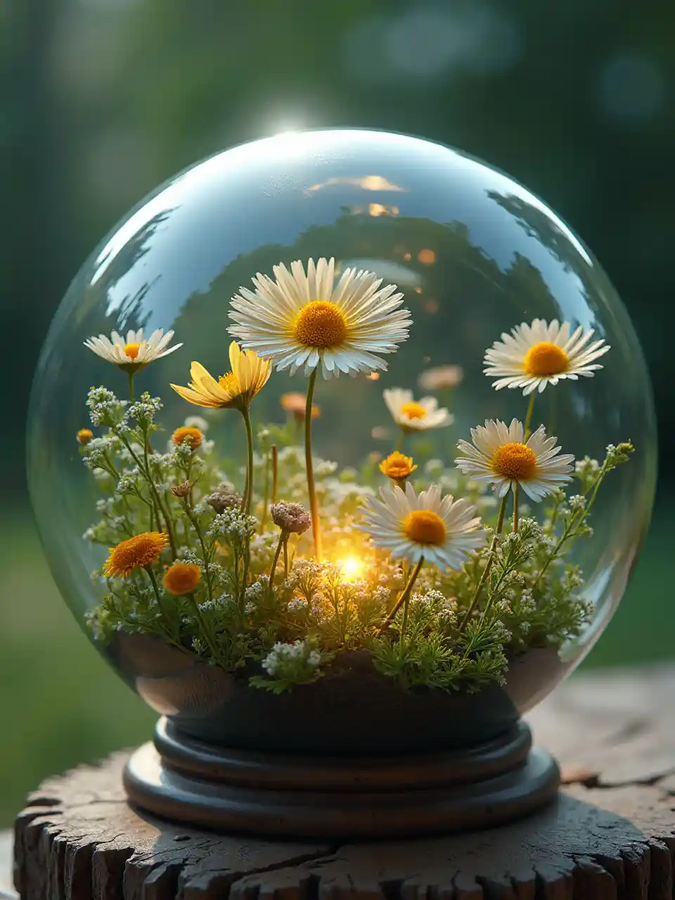 ColtenNzuri sana (((mandhari))) iliyofungwa ndani ya (((mdomo wa glasi))), na nyeti ((mimea na maua)) kutafakari mwangaza laini dhidi ya uso tata wa dunia, kama kusimamishwa katika wakati etheric ya uzuri wa asili