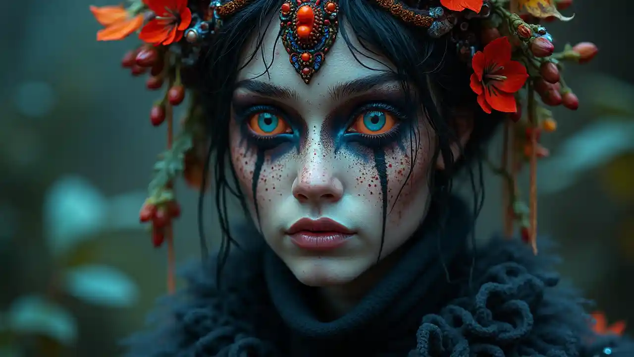 Mtu mwenye kuonekana kuwa halisi sana anatokea katika ufalme wa giza, na uwepo wake ni wenye kutisha na wenye kuvutia. Macho yake makubwa ya upinde wa mvua, yaliyofanyizwa kwa uangalifu mwingi, huonyesha hofu na mshangao. Mavazi yake ni ya mfano, kila uzi na muundo unaeleza siri za kale na falme zilizosahaulika. Mandhari hii ni kukamatwa kwa usahihi wa Hasselblad H4D 200MS Digital Camera, kwa kutumia kina na bokeh ya Mitakon Speedmaster 65mm f/1.4 lensi. Picha hiyo, iliyo na uwiano wa sehemu 1: 2, inavutia kwa njia ya ajabu, ikichanganya uhalisi wa mambo na uzuri wa kilimwengu.