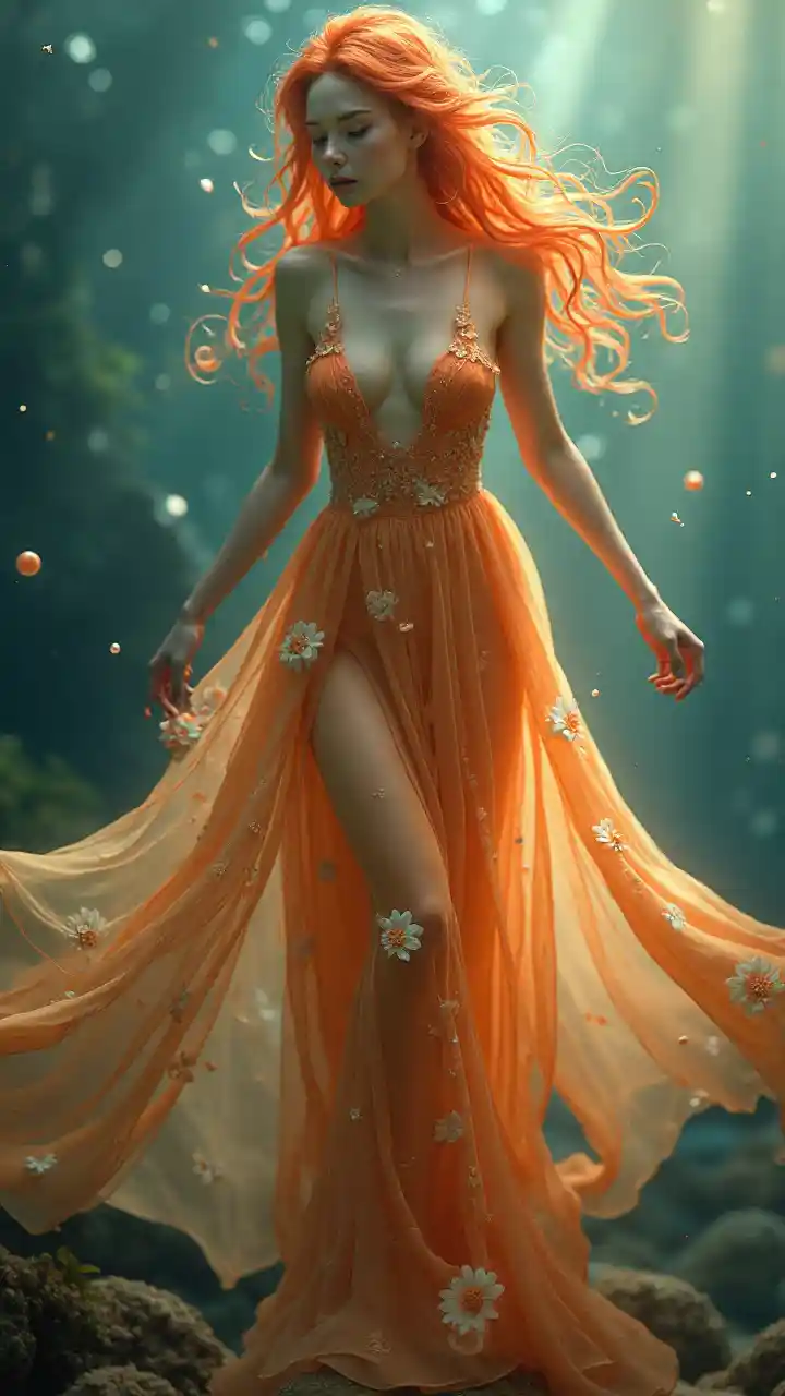 Kiini cha ajabu na chenye kuvutia, rangi nyekundu ya fairy, mwangaza wa ajabu, hutoa hewa ya fumbo na ushawishi. Ngozi yake yenye kung'aa, yenye rangi laini, ya asili, hutoa mwangaza wa kijivu, ikichanganyika vizuri na mazingira yenye kuvutia. Nguo hiyo yenye kuvutia, yenye kung'aa, yenye kupambwa kwa michoro ya maua, huambatana na mtiririko wa bahari, na hivyo kukamata uzuri wa maji wa fairy. Mazingira ya bahari yenye kung'aa huongeza mandhari ya ndoto, na kuunda picha yenye kuvutia ya ulimwengu wa chini ya maji.