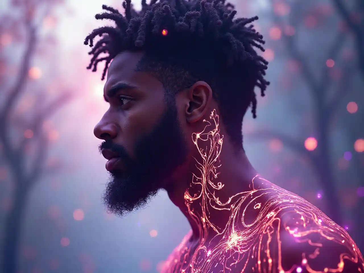 (((Luminous Alcohol Ink Double Exposure Illustration))) ambayo inashirikisha (((Mtu wa Ngozi ya Dhahabu na tattoo ya PinStripe inayoangaza))), ikionyesha maelezo ya kijani (mbele ya kijani) na (mchanganyiko wa rangi ya zambara na nyeupe) ambayo inaunda ushiriki wa mwanga na. Mandhari huangaza (kwa upole kuenea kiini), kujenga surreal symphony Visual kwamba ni ajabu na ethereal