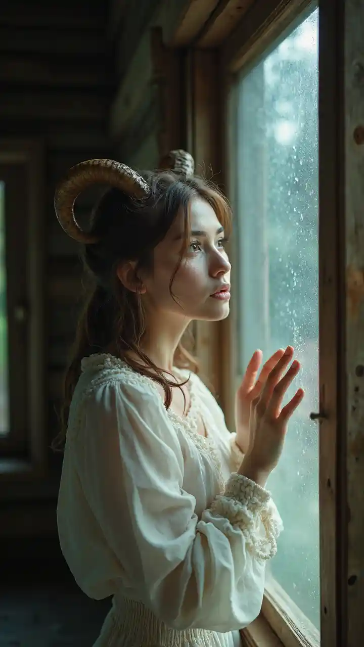 Wazia mandhari ambayo huzidi mipaka ya upigaji picha, ambapo mwanamke ana pembe. Yeye ni drift ndani ya nyumba ya mbao alifanya na fairy, uwepo wake tofauti makali dhidi ya mandhari ya kichawi. Mtazamo wake, uliopotea katika upeo wa asili, husimulia hadithi nyingi ambazo hazikutajwa. Kazia fikira mikono yake - yenye rangi ya kijivu, karibu isiyoonekana, ambayo inachukuliwa kwa ishara ya hisia, labda ikifuatia kioo baridi cha dirisha. Mikono hiyo si sehemu tu ya mwili wake; ni wasimuliaji wa hadithi. Picha inapaswa kuwa na sifa za kipekee za picha iliyochukuliwa kwenye kamera ya Canon 5D Mark IV na filamu ya Kodak Ektar - rangi ni za kina na za sauti, maelezo ni ya kina lakini yana ubora wa kika, na kuna chembe nyepesi ambayo inaongeza safu ya kina na ya kweli. Hii si picha tu; ni wakati wa hisia, iliyohifadhiwa katika wakati, kumkaribisha mtazamaji si tu kuona, lakini kuhisi.