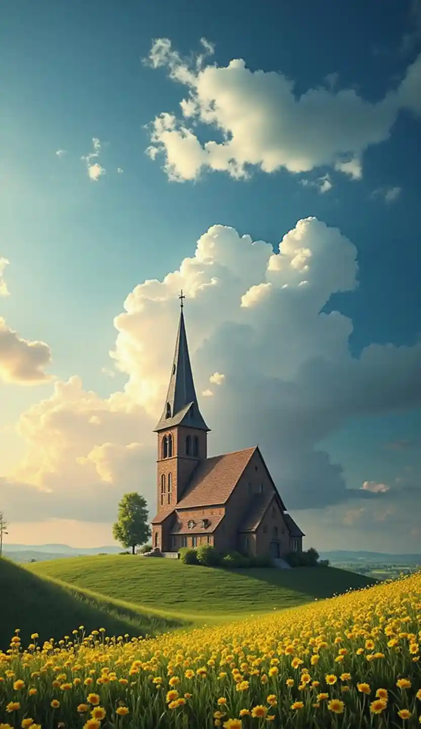 katika picha high definition、Spring Prairie Image Masterpiece 、 rangi mkali 、Mtazamo wa ajabu wa kuigiza mtindo mkali 、Kijiji kidogo na Kanisa la Ulaya