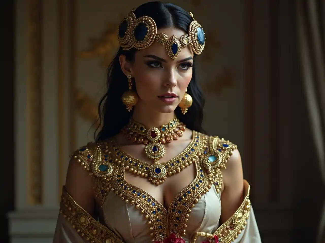 Picha ya Eva Green kama roho mbaya, Ibilisi Malkia wa Sheba au Bilquis, mungu wa kike Sumeria, kuangalia voluptuous, katika tunic uwazi richly decorated na dhahabu embroidery, wote stacked na vito vya thamani - dhahabu, fedha, lapis lazuli, cornelian, agate na calcedony beads, na pete kubwa dhahabu na kofia ya maua ya dhahabu na cornelian ya India na Afghan lapis lazuli, katika mkono wake yeye kushikilia bakuli la dhahabu, ndani katika mtindo wa Sir Edward John Poynter Ziara ya Malkia wa Sheba kwa Mfalme Sulemani, ajabu, Halloween, picha, action risasi, harakati, epic, high definition