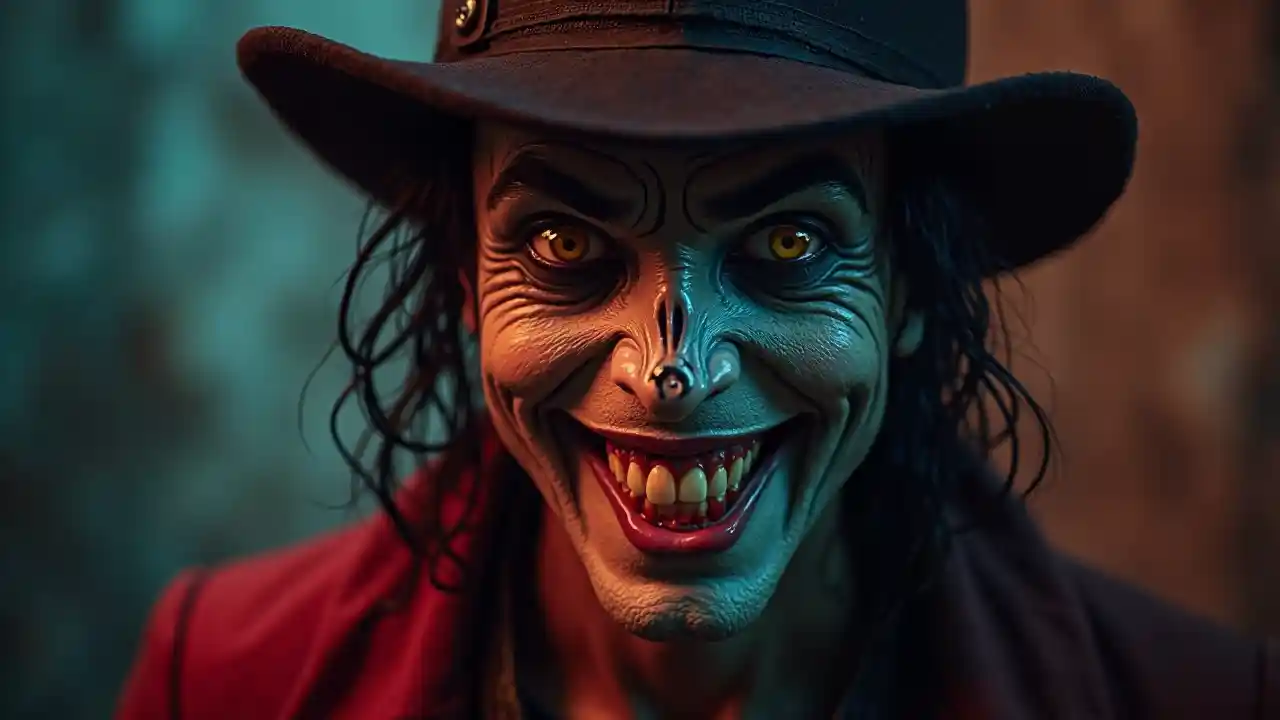 Michael Jackson wa zamani kama tabia mbaya ya kutisha amevaa mavazi ya Halloween, tabasamu mbaya, pua ndogo, rangi za kupendeza, rangi za tofauti