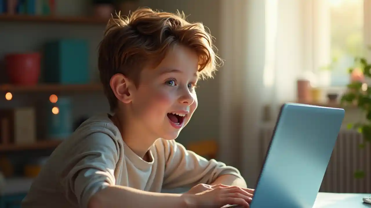 Mwanafunzi mchanga, karibu miaka 15, ameketi kwenye dawati na kufanya kazi kwenye kompyuta. Uso wake unaangaza sana. Mandhari ya mchana, chumba cha kulala cha mwanafunzi. Yeye ni furaha na msisimko, macho na mdomo wazi, minara katika background, mchana taa, focus laini, rangi mkali
