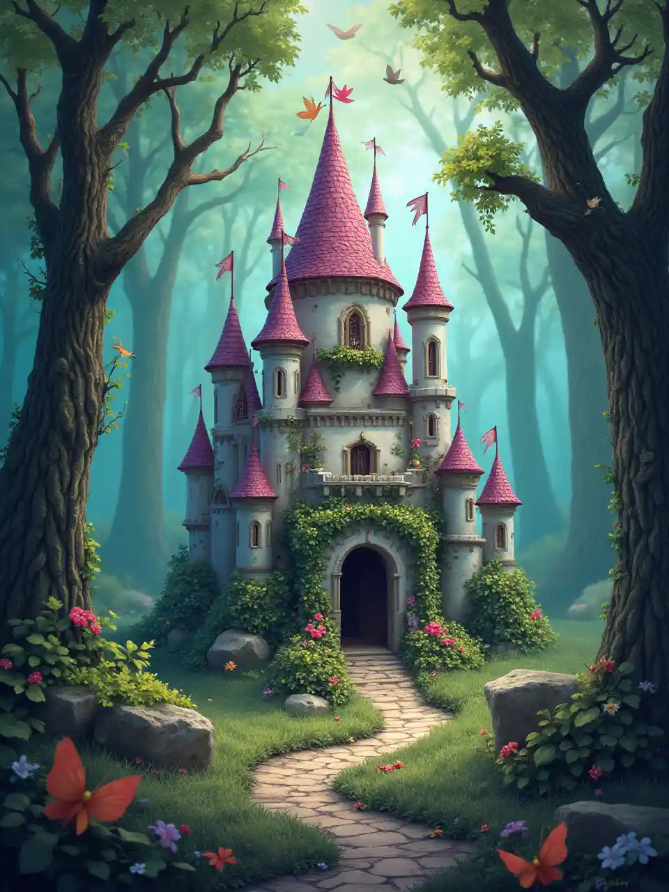 Unda mandhari ya hadithi ya kuwaziwa yenye kupendeza na ngome, majini, na msitu wa ajabu