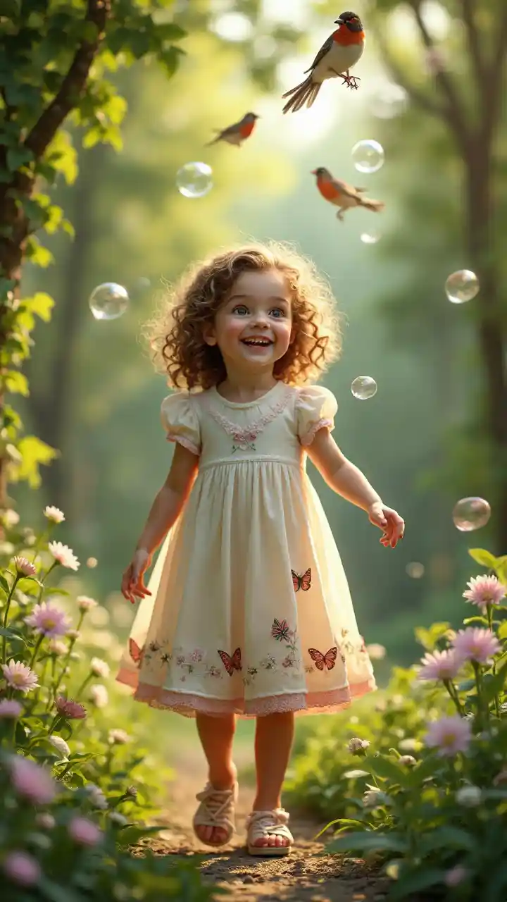 Msichana mmoja Mzungu mwenye umri wa miaka 5 mwenye nywele nyembamba anavaa mavazi yaliyochongwa kwa vipepeo. Mzabibu wenye kung'aa na ndege-mwitu wanaopaaza sauti humweka katika mazingira yenye kuvutia.