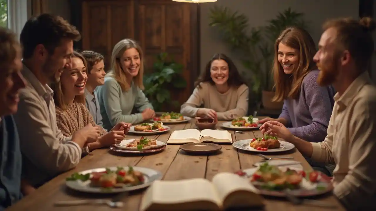 Familia yenye furaha ikikaa karibu na meza ya mbao yenye rangi ya kijijini na sahani za nyama, samaki, na saladi. Wote wanatabasamu kwa amani, kana kwamba ni wakati wa chakula cha mchana cha Ijumaa Kuu. Biblia iliyofunguliwa iko katikati. Nuru ya joto na laini.