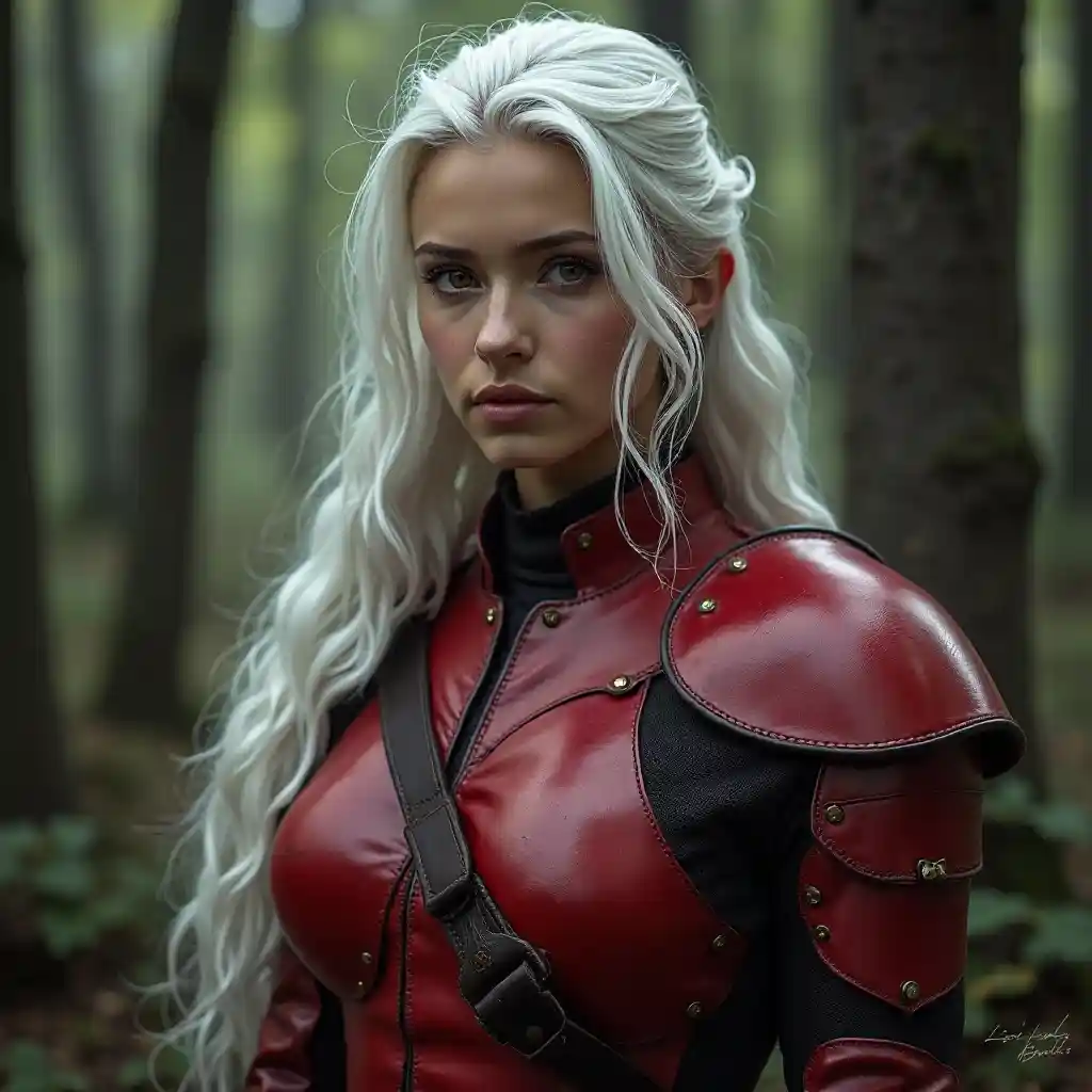 JulianMsichana mzuri na nywele nyeupe, kutumia umri wa ajabu nyekundu vita silaha. peke yake katika msitu,