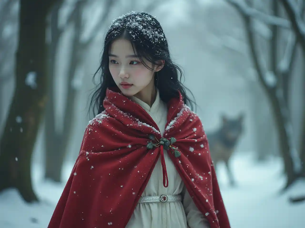 Mchawi wa Dunia ya Ndoto, nguo za ndani nyeupe na kanzu nyekundu, kuangalia safi, kuangalia wasio na hatia, ngozi nyeupe, uso cute, uso mtoto, soksi, mwili kamili, kupotea katika misitu. Wakati wa theluji, mtu-mwitu anamfuata kutoka mbali. hyper kina, ultra kweli, kina sana, surreal ukungu nzito, AI maalum exquisitely nzuri, kikamilifu ultra kweli vijana Korea, sura gorgeously kina, decal sumptuous, uwiano mwili kamili, ultra pale, ultra glamorous, shading kamili, tofauti, HDR, high res, 64k