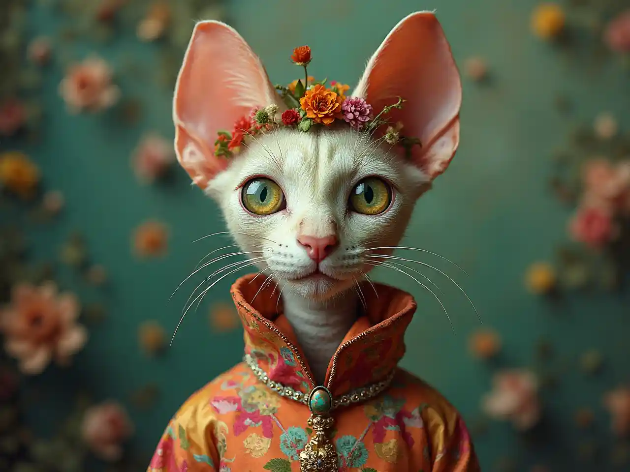 kigeni paka kiumbe na uso mzuri, katika mtindo wa mlipuko na machafuko, photorealistic pastiche, picha kuchukuliwa na provia, mavazi ya rangi, picha matte, sanaa isiyo ya kweli, fantasy paka, katika mtindo wa surrealism enchanting, picha na maana ya siri, picha za uongo, jamie Heiden, texture-tajiri, uzuri wa ajabu, sanaa ya qajar, katika mtindo wa Art Nouveau, Alphonse Mucha, sauti, mandhari ya maua, mavazi ya kifahari