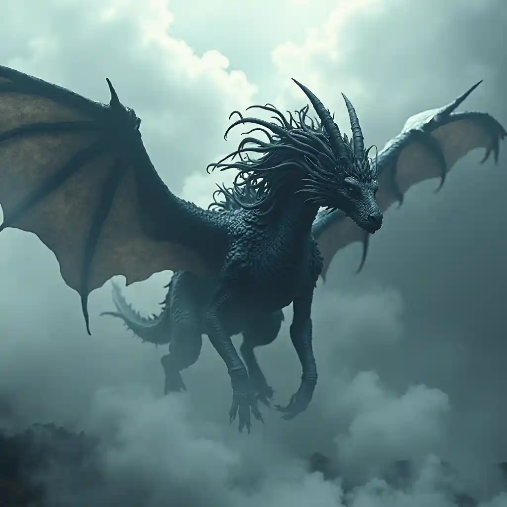 Joka kubwa sana lenye nywele nyeusi zilizochukuliwa na upepo na mabawa yenye miamba mingi, hupaa kupitia ukungu wa karibu, na ngozi yake nyeupe inatofautiana na moshi mweupe na nuru ya anga. Kuchochewa na kazi ya Andrei Riabovitchev, JohnnyD, Massimo Caggese, Peter Mohrbacher, na wengine, eneo linavutia hisia mbaya na sinema, ikikumbusha picha ya juu na taa za kihistoria. Joka linatumia nafasi ya kushangaza katikati ya anga yenye tabaka za fantasy za makabila na alama za kiorthod, mazingira yanayozingatia hisia za kihalisi za 8k. Muundo wa jumla ni wa kina sana na wa juu sana, ukimkaribisha mtazamaji katika ulimwengu ambapo ukweli hufichwa na ajabu.