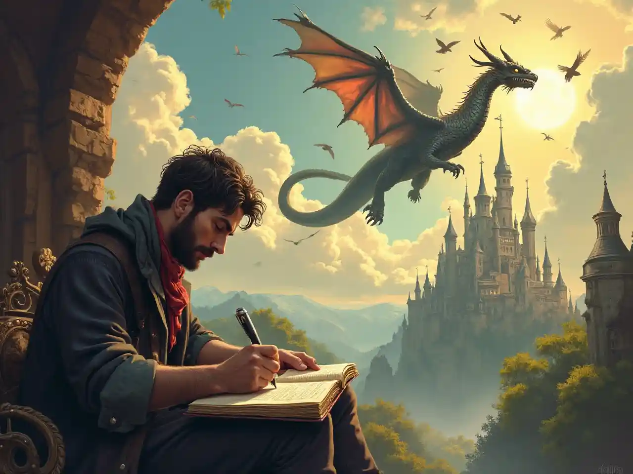 (Steampunk fantasy artwork), mtu alizingatia kuandika katika daftari, (mbinu ya mbele), joka kubwa linalopanda juu, (mfumo wa mvuke wa kuvutia), ngome ya kichawi nyuma, (angavu ya ajabu), makundi ya ndege wanaoruka, miundo ya saa, rangi ya dunia, mwanga wa joto na wa kuvutia, mtindo wa picha za hadithi, (mfumo wa kina, wa hali ya juu, HD).