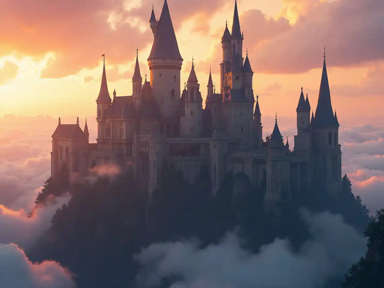 Grey juu ya ndoto ngome, kuvutia bold contours, majengo majestic kuinuka dhidi ya kutua kwa jua, joto dhahabu na rangi ya machungwa kuunganisha na rangi ya zambarau katika anga, ngome kuzungukwa na ukungu ethereal, kuongeza hisia ya siri, textures kina sana na vivuli juu ya kuta ngome, mazingira ya kuvutia, kina sana, na kina immersive.