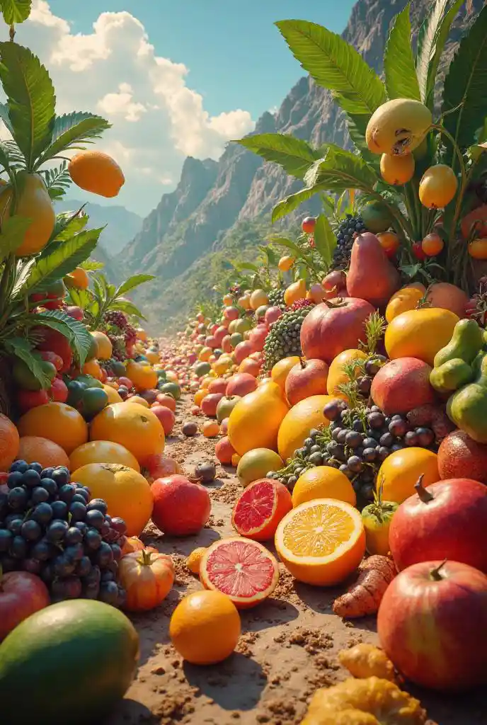 A high-resolution, photorealistic, 8K digital artwork depicting a surreal, fantastical scene of a diverse array of vibrant, larger-than-life fruits arranged in