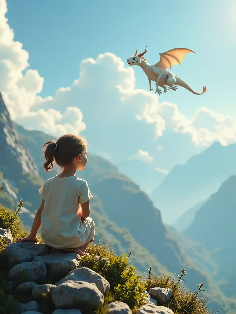 msichana mdogo kuangalia juu ya mlima nyuma mtazamo kamera angle, mbali sana rafiki tabasamu joka nyeupe kuruka katika anga nyeupe, fantasy, kweli