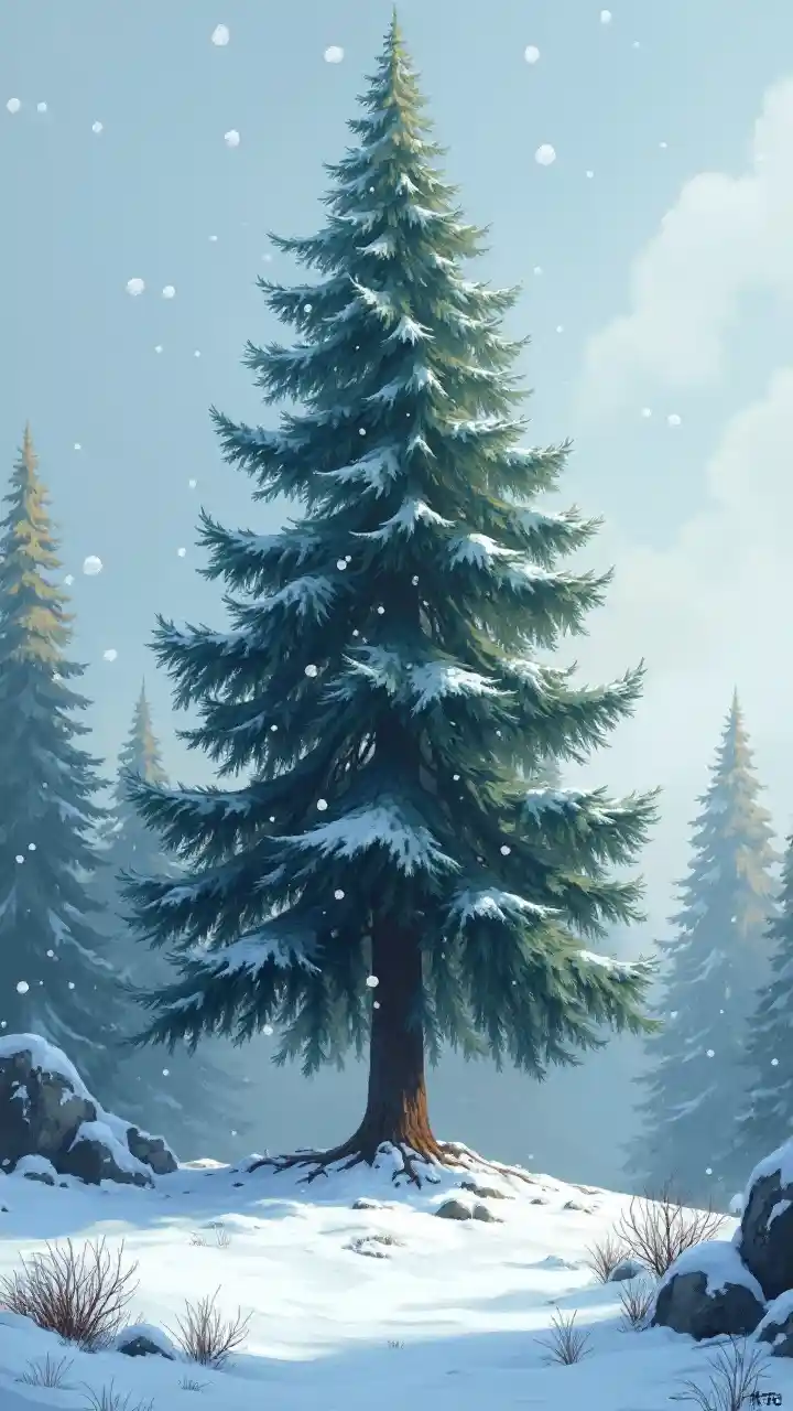 Wazia mti mrefu wa pine ukisimama katika eneo lenye theluji, na makombe ya theluji yakianguka kwa upole. Mtindo unapaswa kuwa fantasy, uchoraji mafuta sawa na kazi ya sanaa kupatikana katika Magic: Mkusanyiko mchezo. Usiweke sahihi ya msanii au maandishi yoyote kwenye picha.