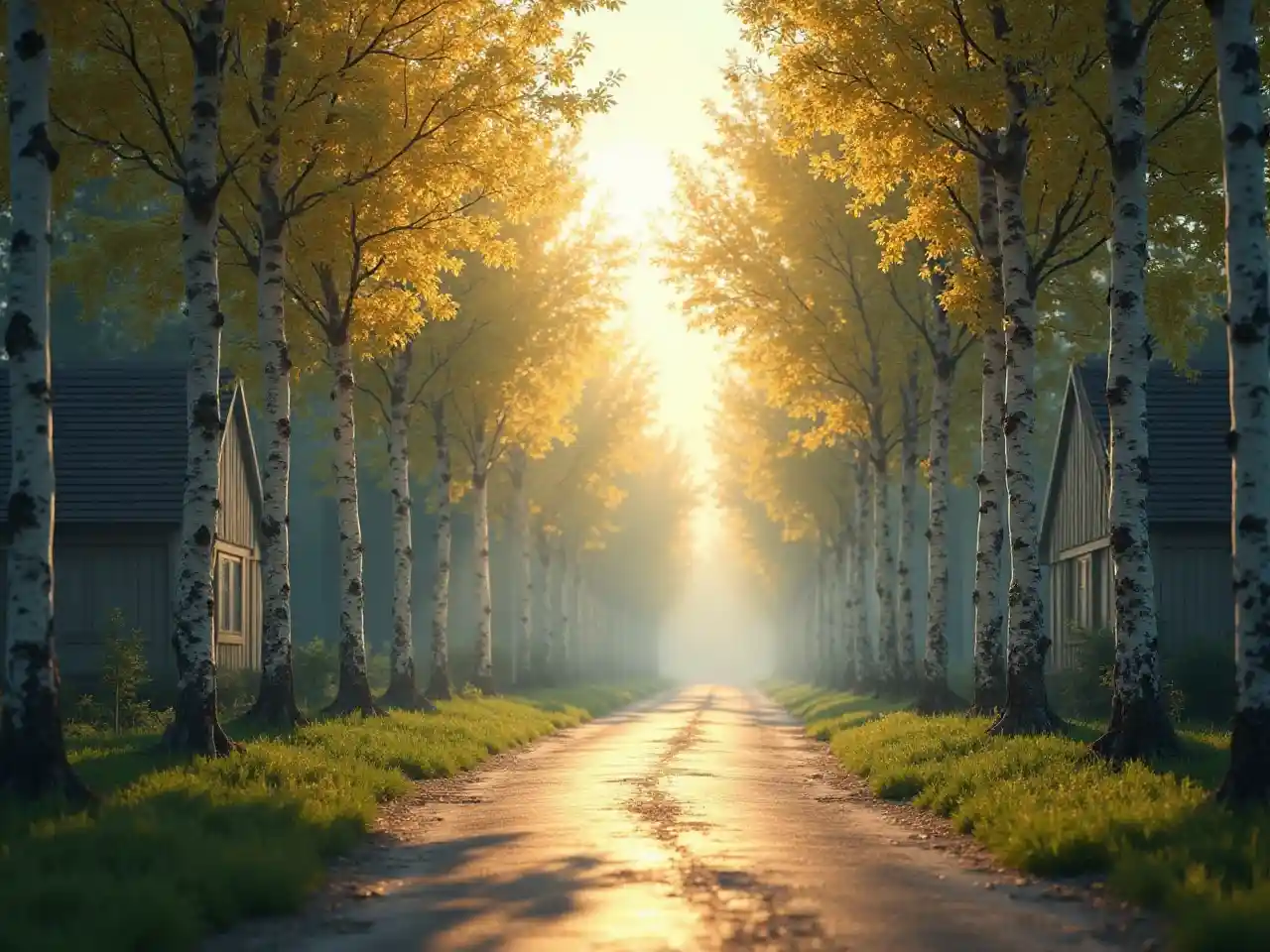 Kwa upande mmoja wa barabara ilikua safu ya birch, kwa upande mwingine wa barabara block ya safu ya nyumba ndogo. I nyeusi kioo flying kitu akaruka katika hewa. mwanga wa ajabu. 3D fantasy. surrealism style. hyper kina. mionzi ya jua ya rangi tofauti.