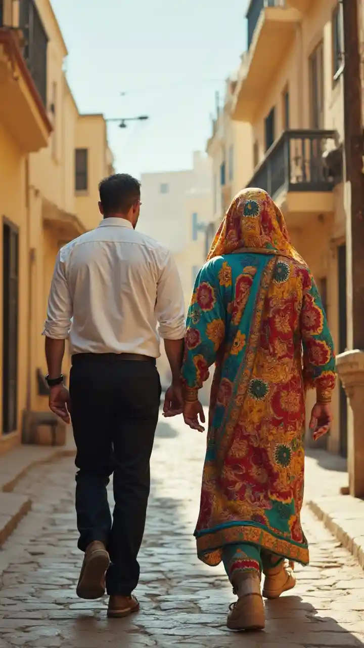 Danielmtu katika shati nyeupe na suruali nyeusi kutembea chini ya barabara na mtu katika mavazi ya rangi, Farid Mansour, esthetics, full h, sanaa ya Misri