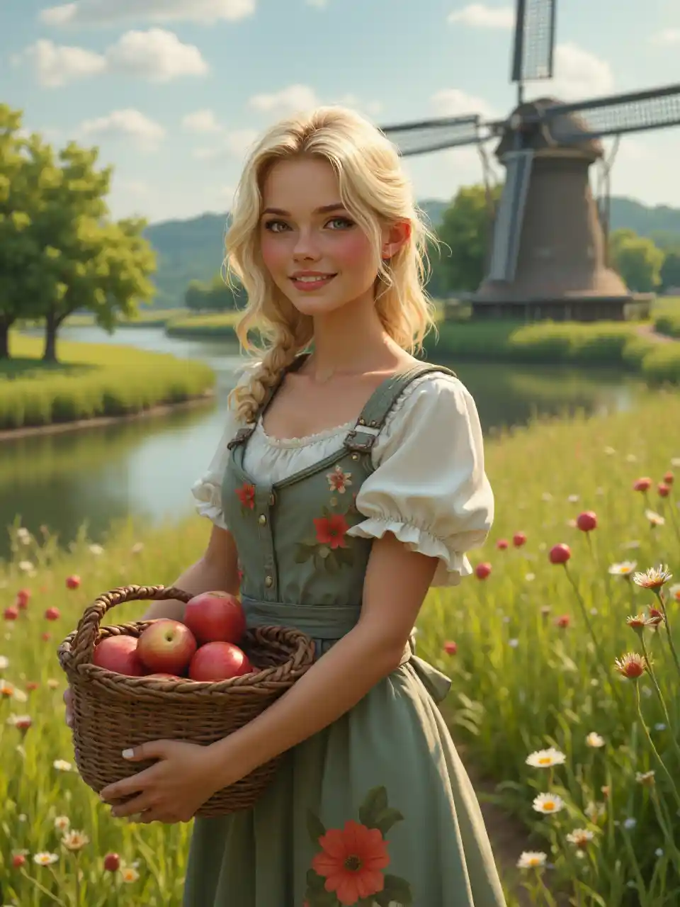 picha ultra kweli ya msichana mkulima wa miaka 25, nywele nyeupe, tanned, na mavazi na maua juu yake. Yeye inaonekana lovely. Anasimama kwenye shamba. Kila mahali kuna nyasi na miti ya matofaa. Nyuma kuna mto na kilima cha upepo. Ana kikapu cha maapulo mikononi mwake.