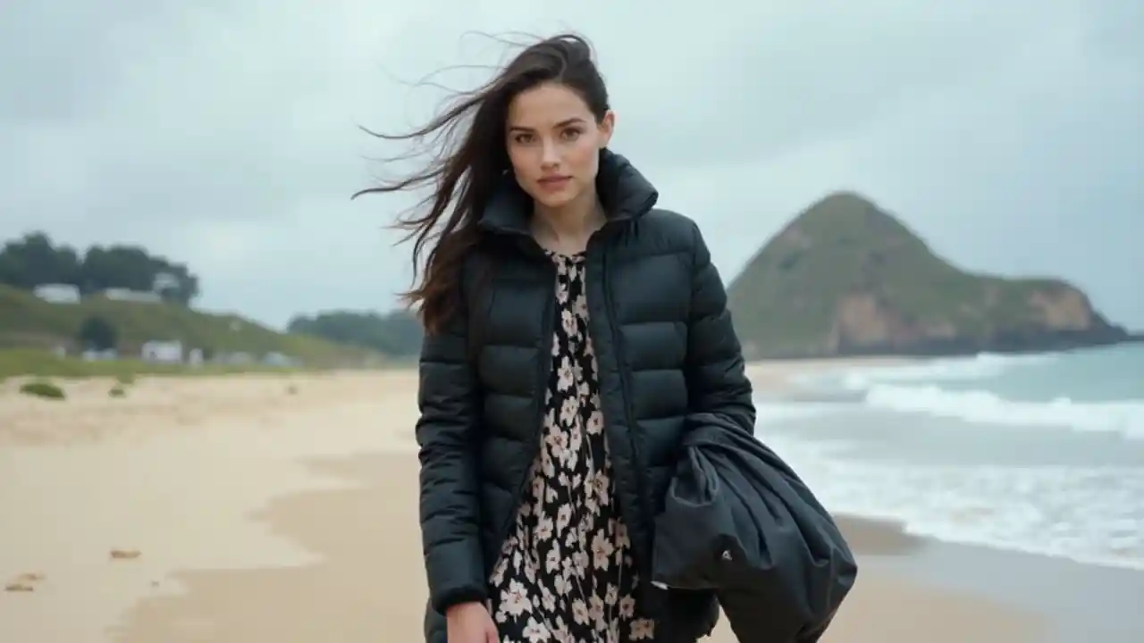 mwanamke nyeusi mfano kutembea juu ya fashion pwani runway kuvaa nyeusi puffer koti na kitu kilichobadilika uchapishaji