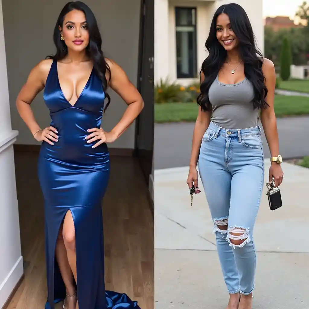 Ulinganisho wa mwanamke akiwa amevaa nguo mbili tofauti: upande wa kushoto, amevaa vazi la bluu lenye kung'aa, lenye shingo ya V na kipande cha juu, akijiweka ndani ya nyumba na mkono mmoja kwenye kiuno; upande wa kulia, amevaa nguo ya kijivu na jeans nyepesi, amesimama nje akishika funguo na simu, akiwa na saa ya dhahabu.