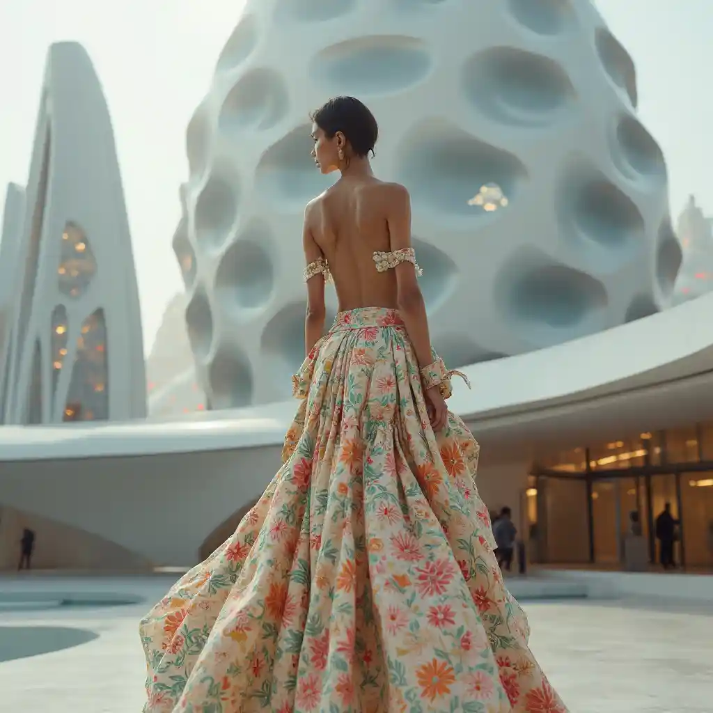 LunaMtindo wa mtindo wa hali ya juu, katika mtindo wa Wes Anderson mbele ya jengo la baadaye, na mpangilio wa kompyuta
