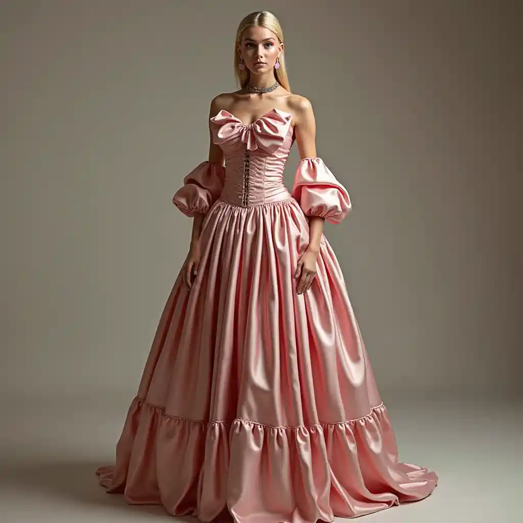 hyper photorealistic full length fashion shoot studio full length shot of an immensely cute woman with slicked back blonde tucked in a neat bob (((kuvaa kijivu satini vivutio na kola ya juu na shingo ya upinde na kubwa Victorian kondoo sleeves))), ambayo emphasizes yake (((fantastically proportional))) na huvutia miguu yake (((mzuri))), pink-shaped hanging earrings, simple pendant necklace. Kusimama. Kuweka mfano.