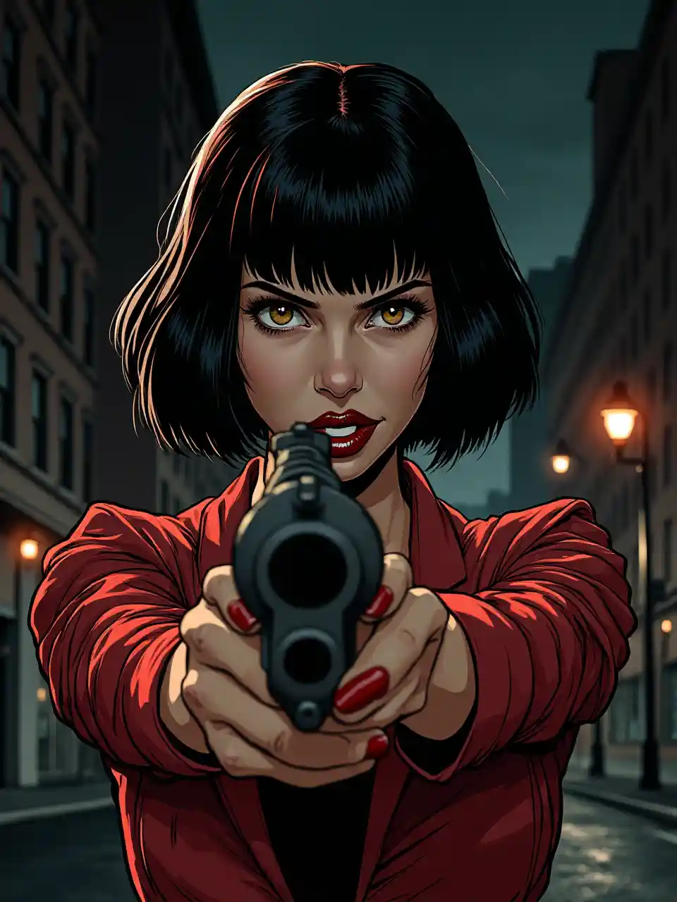 Uzuri, uhalisi, nuru, ubora wa sinema, miale ya mwanga, kucheza kwa kivuli na mwanga, Mandhari ya kitabu cha comic ya noir inayoonyesha femme fatale yenye kuvutia na rangi nyekundu na kucha zinazofanana, ikibeba bunduki inayoelekeza moja kwa mtazamaji. Nywele zake zenye nguvu na uso wake wenye nguvu huonyesha uhakika na hatari. Jiji hilo ni lenye giza usiku, na majengo marefu na taa za barabarani zinaangaza. Rangi hizo ni nyeusi na nyeupe, na nyuso nyekundu tu ndizo zinaonyesha tofauti. Mandhari hiyo ina msongo mwingi, na inawakilisha watu wenye maono ya ajabu na wenye maono ya ajabu.