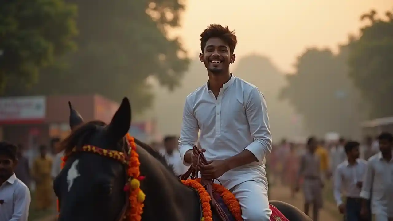 Chini ya mwangaza wa jioni, kijana mmoja anapanda farasi aliyepambwa, na watu wanafurahi. Akiwa amevaa kurta nyeupe, anaonekana kwa tabasamu kubwa wakati vilemba vya maua vya sherehe vinapopamba shingo ya farasi, ikilinganishwa na manyoya yake meusi. Mahali pa nyuma panaonyesha ishara zisizo wazi, na watu wanapita karibu, na hilo linaonyesha kwamba kulikuwa na tukio la kijamii. Mandhari hiyo imewekwa kwenye njia ya mchanga, ikidokeza sherehe za nje, labda sherehe ya kijiji au ya kijiji, huku giza dogo likiongeza msisimko wa wakati huo. Kwa ujumla, picha hiyo inaonyesha sherehe na urafiki, na tabia ya kijana huyo inaonyesha furaha.