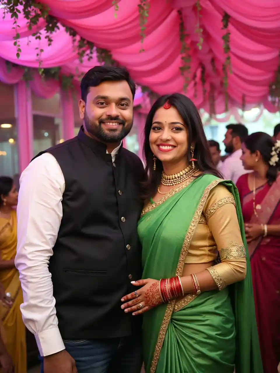 Wenzi wa ndoa wanasimama pamoja, wakiwa na uchangamfu na shangwe, huku hali ya sherehe ikipambwa kwa kitambaa cha waridi na mimea yenye rangi ya kijani. Mwanamume huyo, akiwa amevaa koti la kawaida la rangi nyeusi na shati jeupe, anaonekana kuwa amejipamba vizuri, huku mwanamke aliye karibu naye akiwa amevaa sare ya kijani, iliyo na madoa ya rangi ya kijani ambayo huvutia nuru. Bluu yake ya dhahabu ina rangi nyingi, na pia vifungo vya rangi nyekundu na michoro ya henna iliyochongwa kwenye mikono yake ambayo inathibitisha sherehe za sherehe. Mahali hapo pana nuru nyembamba, ikidokeza karamu za jioni, na ishara za utendaji wenye kupendeza, ikifanya wenzi wa ndoa wahisi kwamba wanafurahia sherehe hiyo. Picha hiyo inaonyesha wakati ambapo watu walikuwa na furaha pamoja, na pia jinsi tukio hilo lilivyokuwa kubwa.