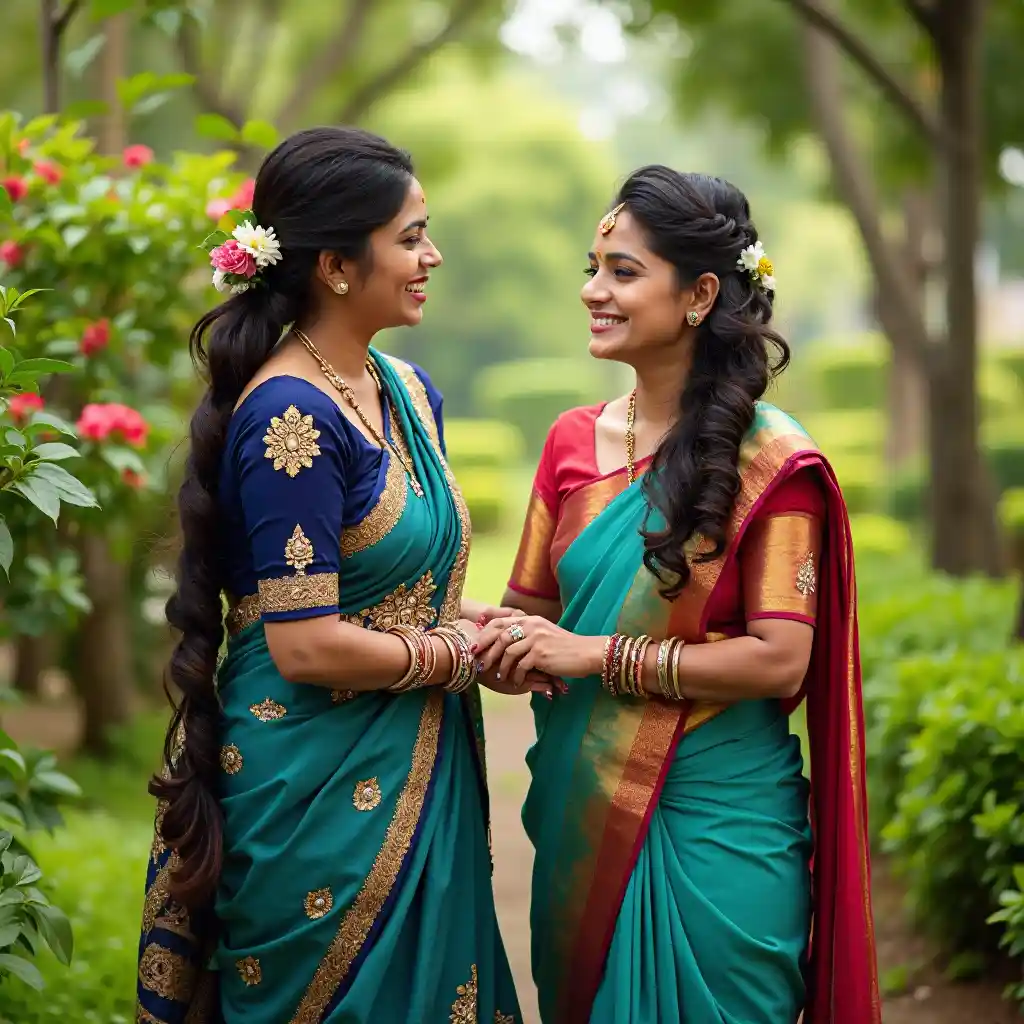 Wanawake wawili waliovaa sare za kitamaduni wanafurahia wakati huo katika bustani yenye rutu, iliyozungukwa na mimea na miti. Mmoja anavaa sarei ya bluu yenye mapambo ya dhahabu, na kingo nyekundu, na yule mwingine ana sare ya rangi ya turquoise yenye rangi nyekundu, zote zikiwa na miundo yenye kutatanisha. Nywele zao zimepambwa vizuri, na moja imepambwa kwa maua mapya, na hivyo kuimarisha hali ya sherehe. Maoni ya wanawake hao yanatoa ishara ya furaha wanapozungumza, na hilo linaonyesha kwamba wanafurahia sherehe au kukutana tena, na kwamba wanaangazwa na nuru ya jua. Muundo huo unaonyesha uhusiano na uchangamfu wa mazingira.