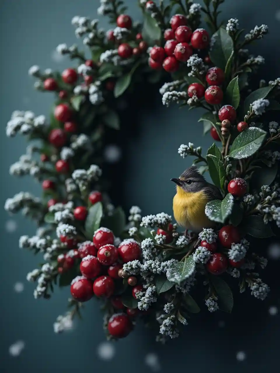 Picha ya Karibu ya Taji ya Krismasi na Ndege na Berries