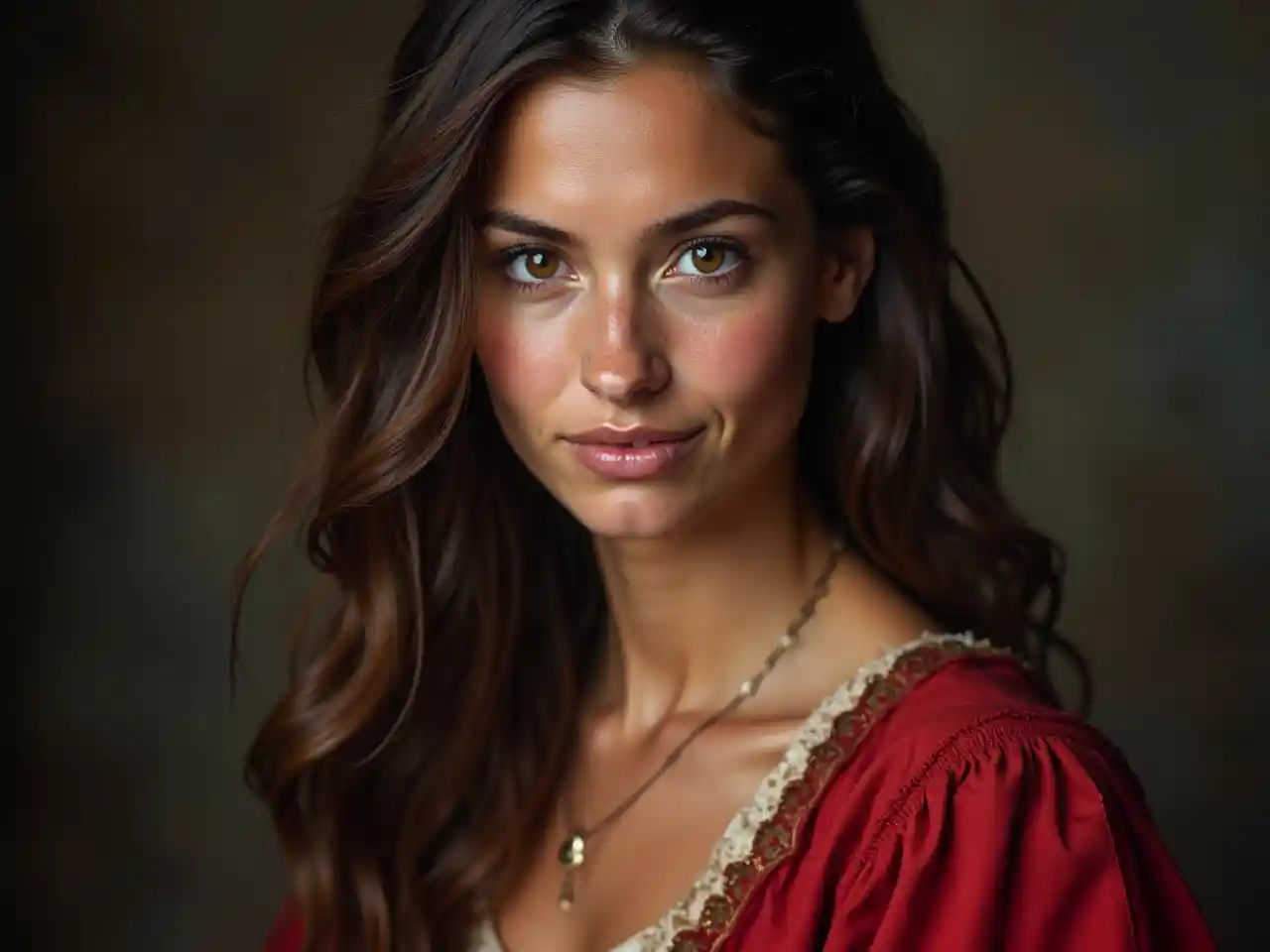 picha ya mwanamke mwenye umri wa miaka 20 mwenye ngozi nyepesi na macho ya kahawia na uso mkali lakini kwa tabasamu ya kuchekesha kwenye midomo yake na nywele ndefu za kahawia nyeusi na mwili mwembamba lakini amevaa nguo nyekundu ya karne ya 16